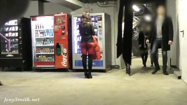 Jeny Smith public walking in red seamless pantyhose